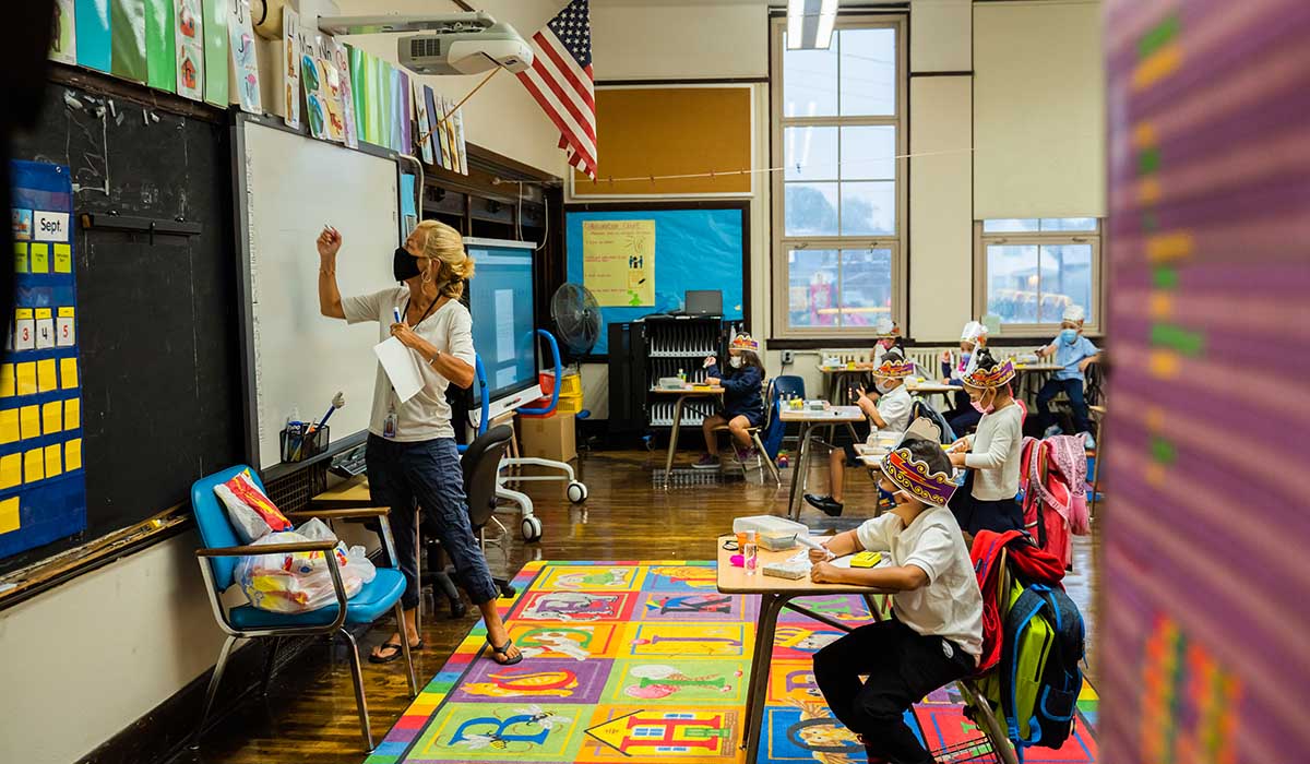 A socially distanced classroom at Burton International Academy in Detroit’s North Corktown neighborhood. (photo by Valaurian Waller)