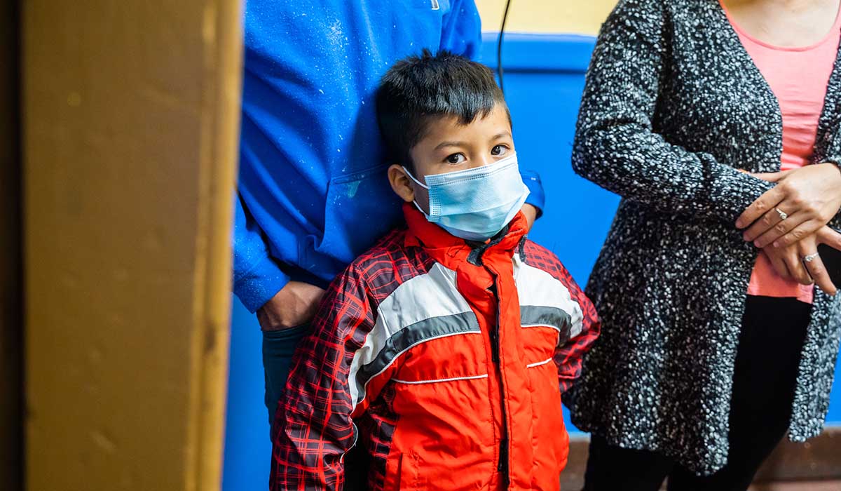 Gadriel, a kindergartner at Harms Elementary, shows off his new DPS mask. (photo by Valaurian Waller)